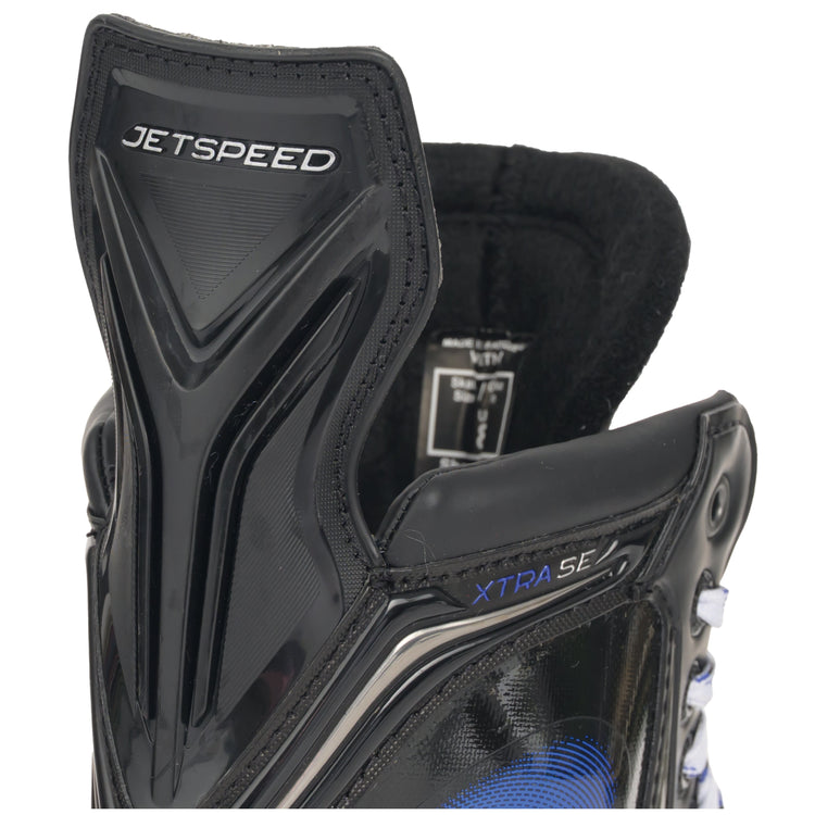 The JETSPEED XTRA SE junior skates are engineered for advanced players seeking speed, agility, and top-tier comfort. Their lightweight, one-piece boot offers a snug fit and optimal energy transfer for powerful strides. The updated forward pitch angle promotes a natural skating posture, enabling quicker toe engagement and more dynamic movement. Equipped with the SpeedBlade XS holder and XS1 Black runners, these skates provide a sharper attack angle and improved edge durability for superior ice performance. A 5mm felt tongue with built-in lace-bite protection ensures lasting comfort and flexibility.