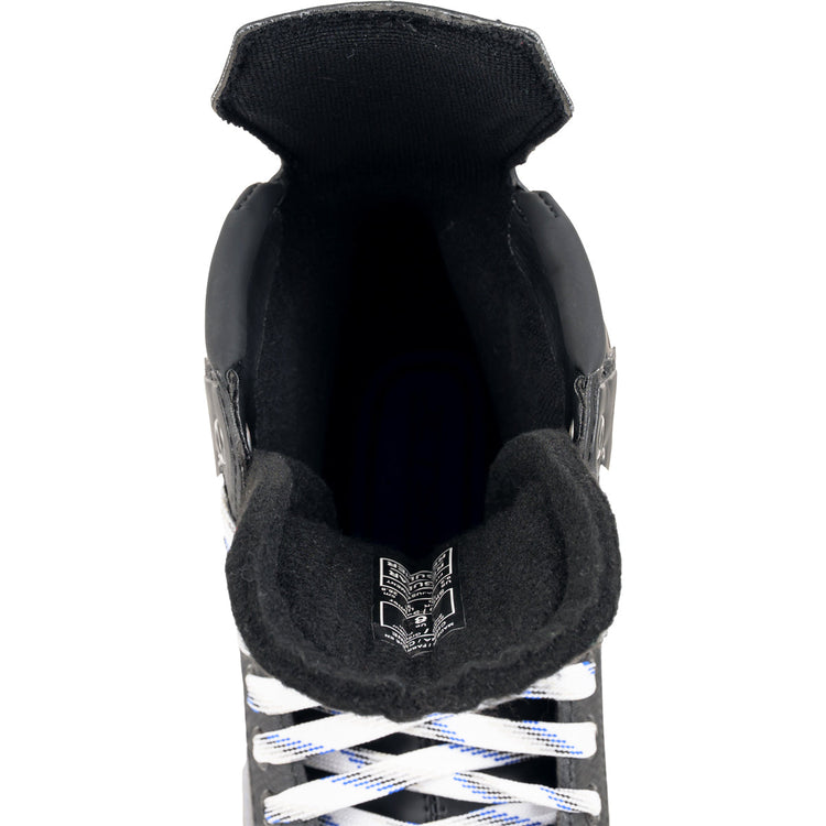 The JETSPEED XTRA skates deliver a blend of high performance, comfort, and long-lasting durability. Featuring a 2D quarter with faux carbon skin, they ensure an ergonomic fit with extra stiffness and support while remaining lightweight. The HD microfiber liner layered with EVA boosts comfort, complemented by ADPT memory foam ankle pads that secure a customized fit. Additionally, the 7mm felt tongue equipped with 3D mesh lacebite protection offers enhanced support, and the CCM Ortholite footbed provides lightweight cushioning for all-day wear.
